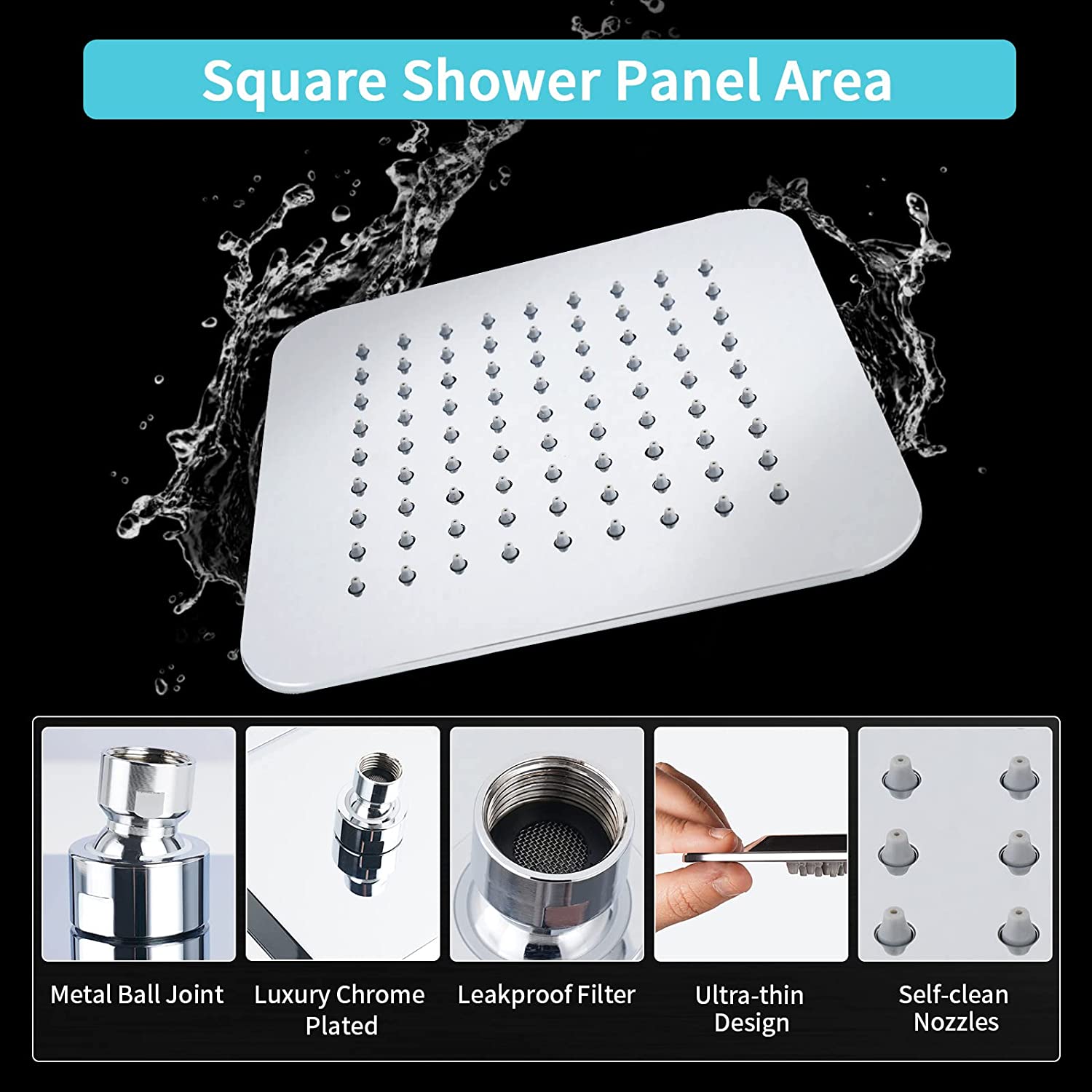 - 8’’ Large Rain Shower Head: Our ultra-thin design and advanced air booster technology offer a superior rain spray shower experience even at low water flow and pressure.The rain shower head made by 304# stainless steel has high rust resistance and longer lifetime.