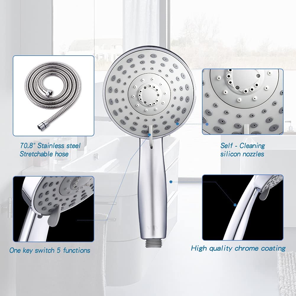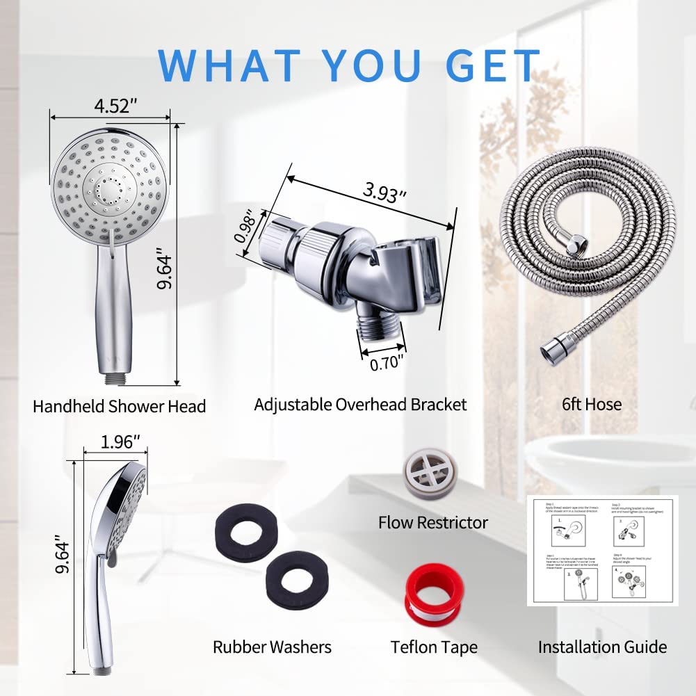 - Practical Accessories in Package: Including hand shower head,70.8 inch extra long stainless steel hose,Adjustable Overhead Bracket, Teflon Tape, Rubber Washers, Flow Restrictor, Installation Guide.