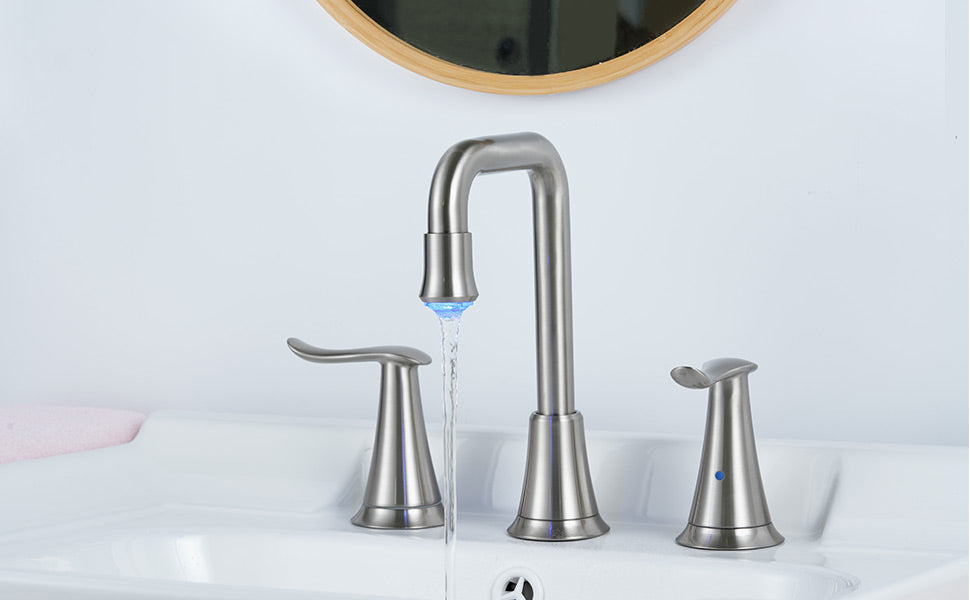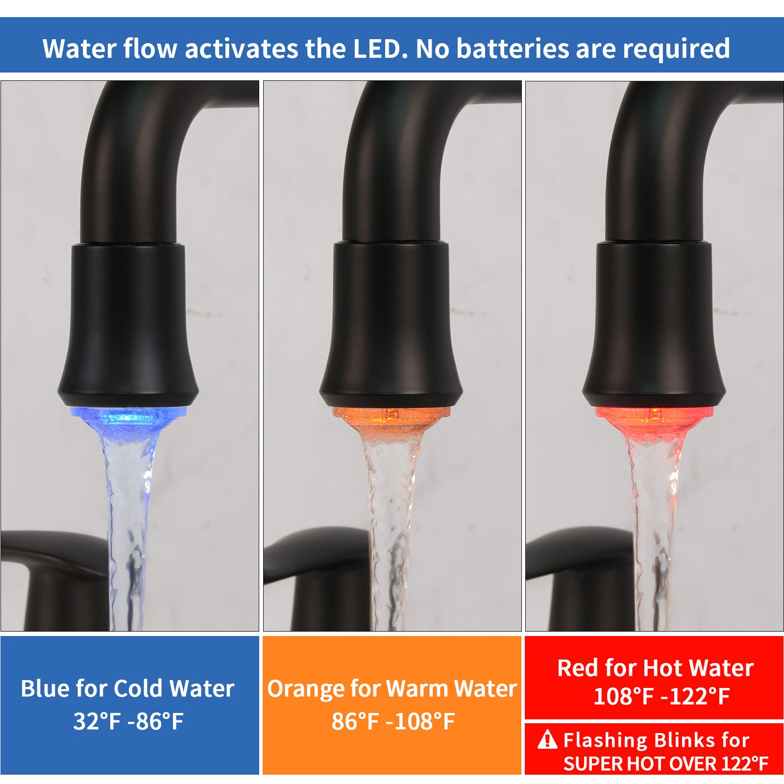 - LED Light Bathroom Faucet Powered by Water: lights up when water flows. Three colors temperature-sensitive LED lights to change with the water temperature: Blue (32℉-86℉),Green (86℉~108℉),Red (108℉-122℉).